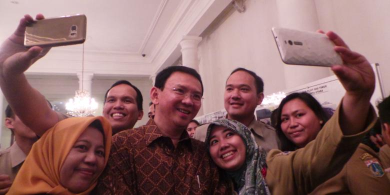 | Gubernur DKI Jakarta Basuki Tjahaja Purnama berselfie dengan pegawai negeri sipil (PNS) DKI Jakarta, di Balai Kota DKI Jakarta, Senin (11/7/2016). |